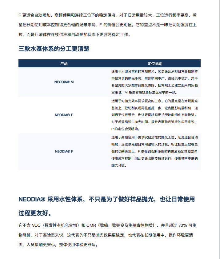 NEODIA® M适用于大多数材料的常规金相抛光。它更适合放在日常制样流程里使用,用于稳定推进样品